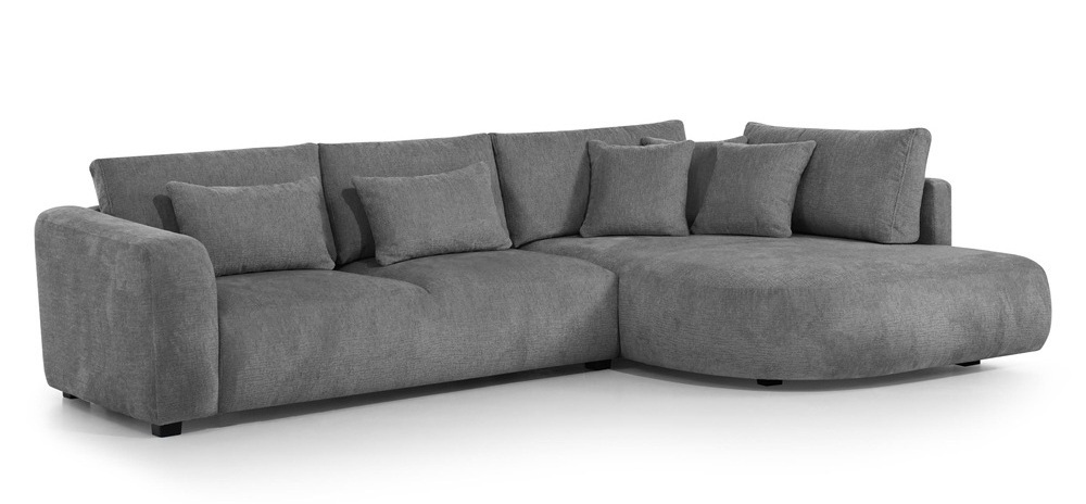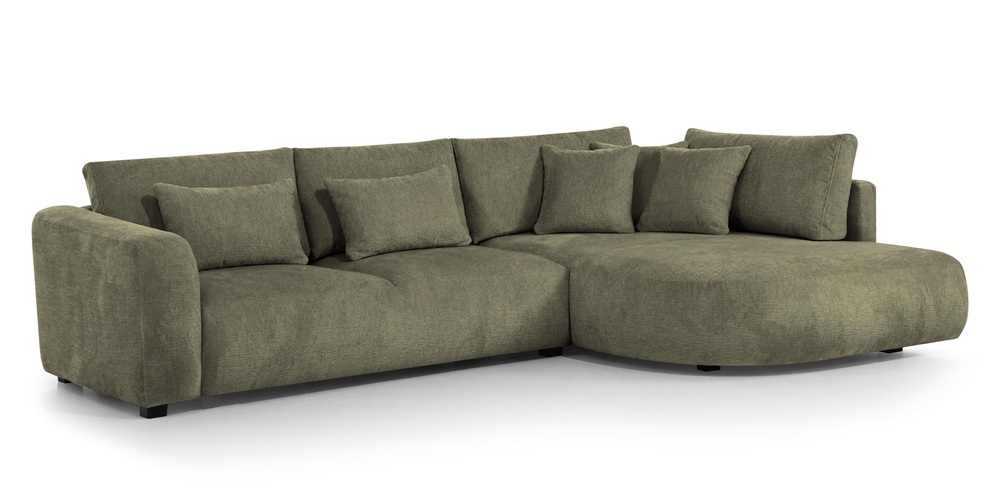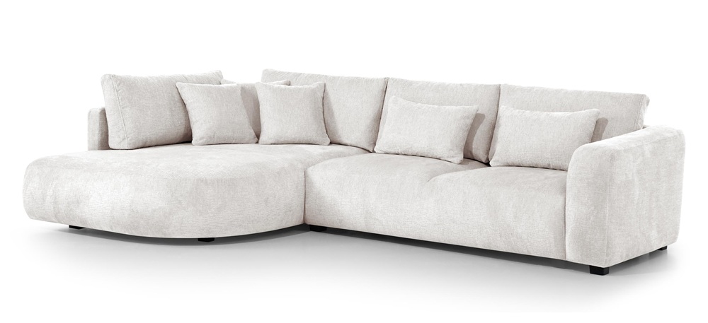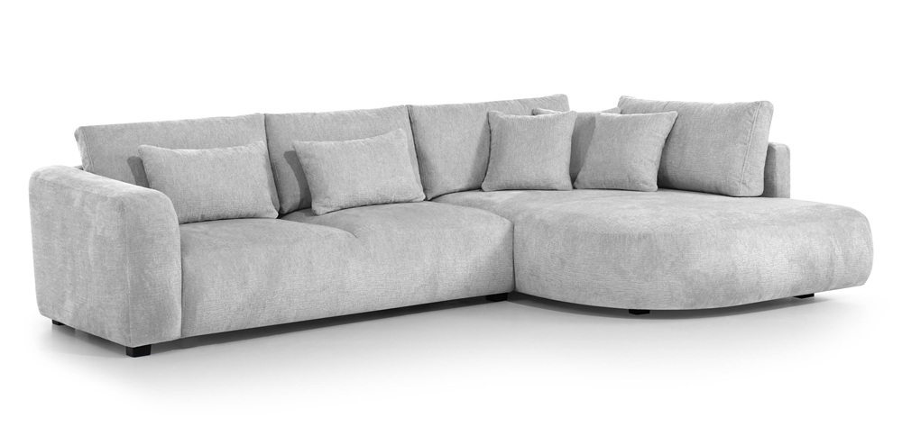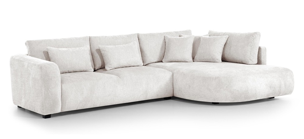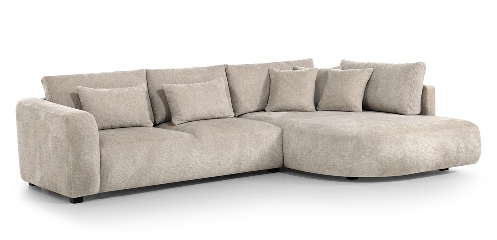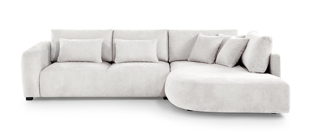 Dieses stilvolle Ecksofa überzeugt durch seine einzigartige, weiche Form und ein minimalistisches Design, das perfekt in moderne Wohnräume passt. Die abgerundeten Linien und die zahlreichen Kissen schaffen eine gemütliche Atmosphäre – ideal zum Entspannen.