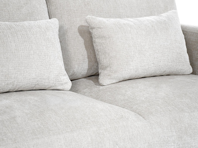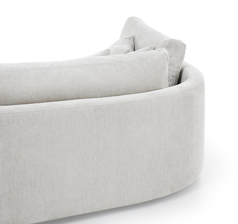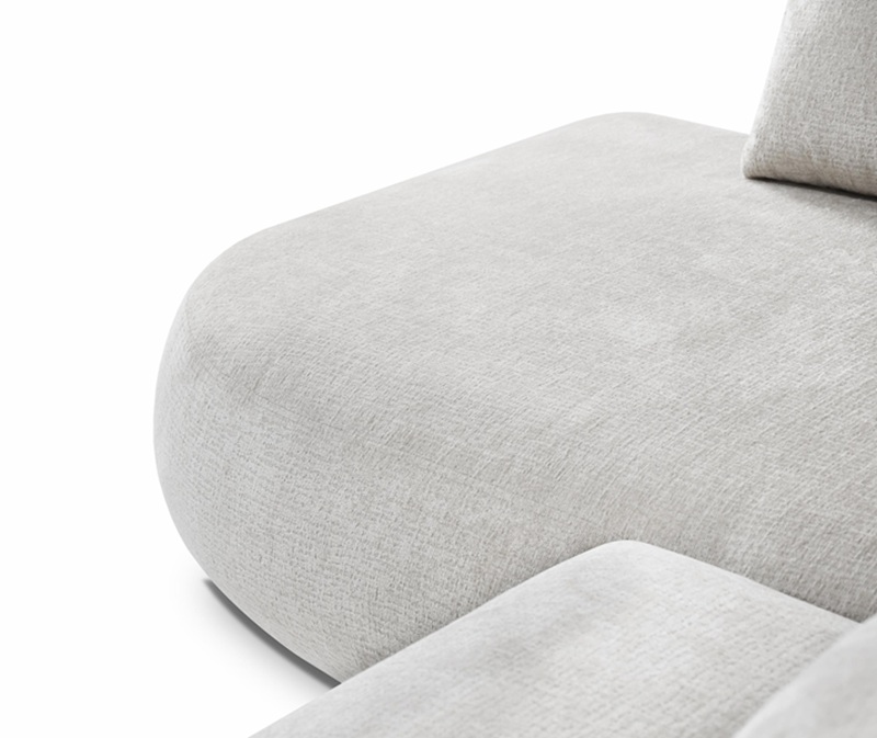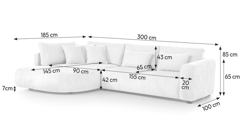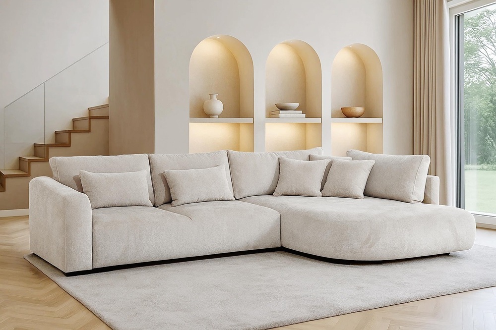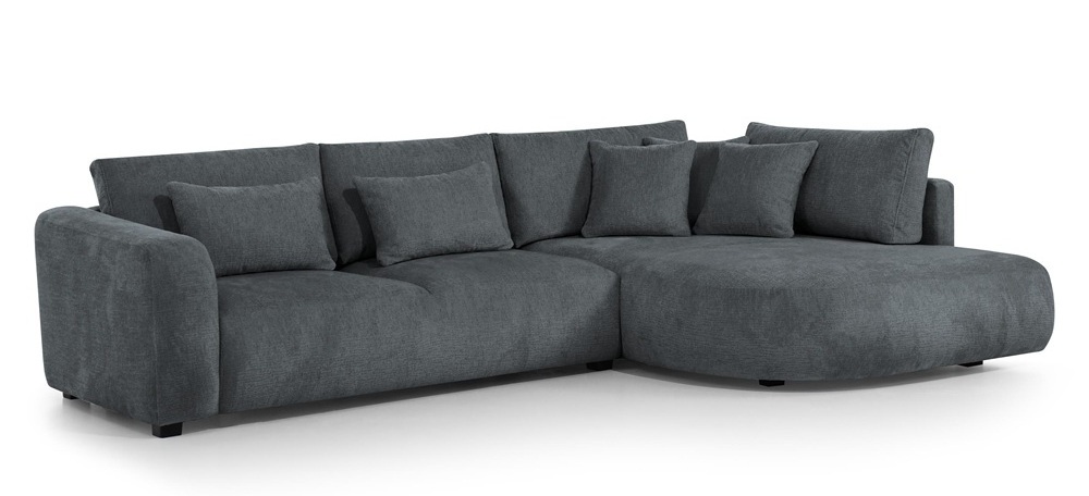 Dieses stilvolle Ecksofa überzeugt durch seine einzigartige, weiche Form und ein minimalistisches Design, das perfekt in moderne Wohnräume passt. Die abgerundeten Linien und die zahlreichen Kissen schaffen eine gemütliche Atmosphäre – ideal zum Entspannen.
